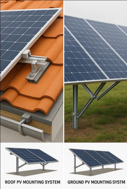 ระบบติดตั้ง PV บนหลังคาได้รับการติดตั้งโดยตรงบนหลังคาของอาคารที่พักอาศัย อาคารพาณิชย์ หรือโรงงานอุตสาหกรรม พวกเขาใช้ประโยชน์จากโครงสร้างอาคารที่มีอยู่เพื่อรองรับแผงโซลาร์เซลล์ การติดตั้งอาจแตกต่างกันไปขึ้นอยู่กับประเภทของหลังคา เช่น หลังคาเรียบหรือหลังคาลาด และมักต้องใช้ขายึดที่ปรับแต่งเองเพื่อให้แน่ใจว่าจะรวมเข้ากับอาคารได้อย่างปลอดภัย ในทางตรงกันข้าม ระบบติดตั้ง PV ภาคพื้นดิน ถูกติดตั้งบนพื้นที่โล่ง โครงสร้างรองรับโดยทั่วไปสามารถปรับได้ ซึ่งช่วยให้นักพัฒนาสามารถปรับการวางแนวแผงและมุมเอียงให้เหมาะสมเพื่อการจับพลังงานแสงอาทิตย์สูงสุด เมื่อเปรียบเทียบกับการติดตั้งบนหลังคา ระบบที่ติดตั้งภาคพื้นดินมักจะมีข้อจำกัดน้อยกว่าในแง่ของพื้นที่และความยืดหยุ่นในการออกแบบ แต่จำเป็นต้องมีความพร้อมของที่ดินเป็นข้อกำหนดเบื้องต้น