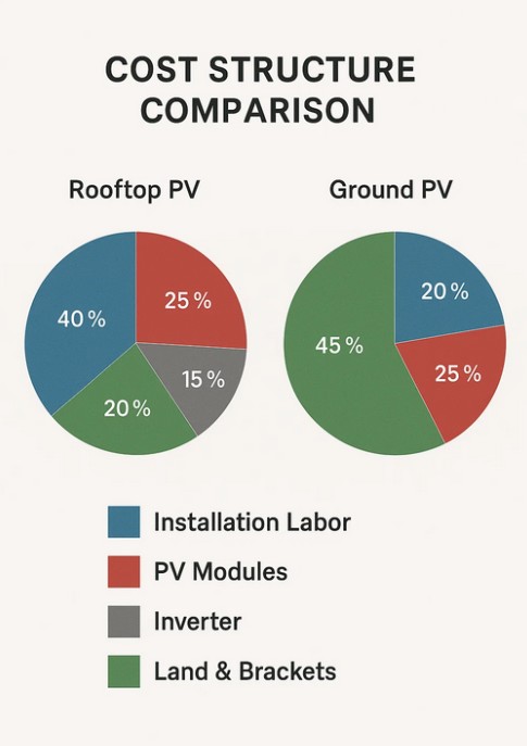 ต้นทุนเป็นปัจจัยสำคัญเมื่อเปรียบเทียบทั้งสองระบบนี้ โดยทั่วไประบบ PV บนหลังคาจะมีต้นทุนการใช้ที่ดินต่ำกว่าเนื่องจากใช้โครงสร้างอาคารที่มีอยู่ อย่างไรก็ตาม ความซับซ้อนในการติดตั้งอาจทำให้ค่าใช้จ่ายเพิ่มขึ้นหากหลังคามีรูปร่างไม่ปกติหรือต้องการการเสริมแรง ระบบพลังงานแสงอาทิตย์ภาคพื้นดินมักจะมีต้นทุนเริ่มต้นที่สูงกว่าเนื่องจากการเตรียมที่ดิน การก่อสร้างฐานราก และโครงสร้างรองรับ อย่างไรก็ตาม ระบบภาคพื้นดินมักจะทำให้เกิดการประหยัดต่อขนาด ทำให้คุ้มค่าสำหรับโครงการขนาดใหญ่ การตัดสินใจลงทุนโดยรวมขึ้นอยู่กับทรัพยากรที่ดินที่มีอยู่ ผลผลิตพลังงานที่คาดหวัง และผลตอบแทนจากการลงทุนในระยะยาว